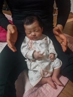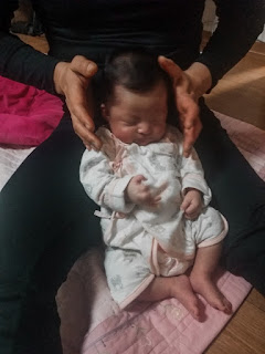 목을 펼 수 없기 때문에 한 손으로 목을 받치고, 한 손으로 아기를 톡톡 치면서 신생아 운동을 합니다.
